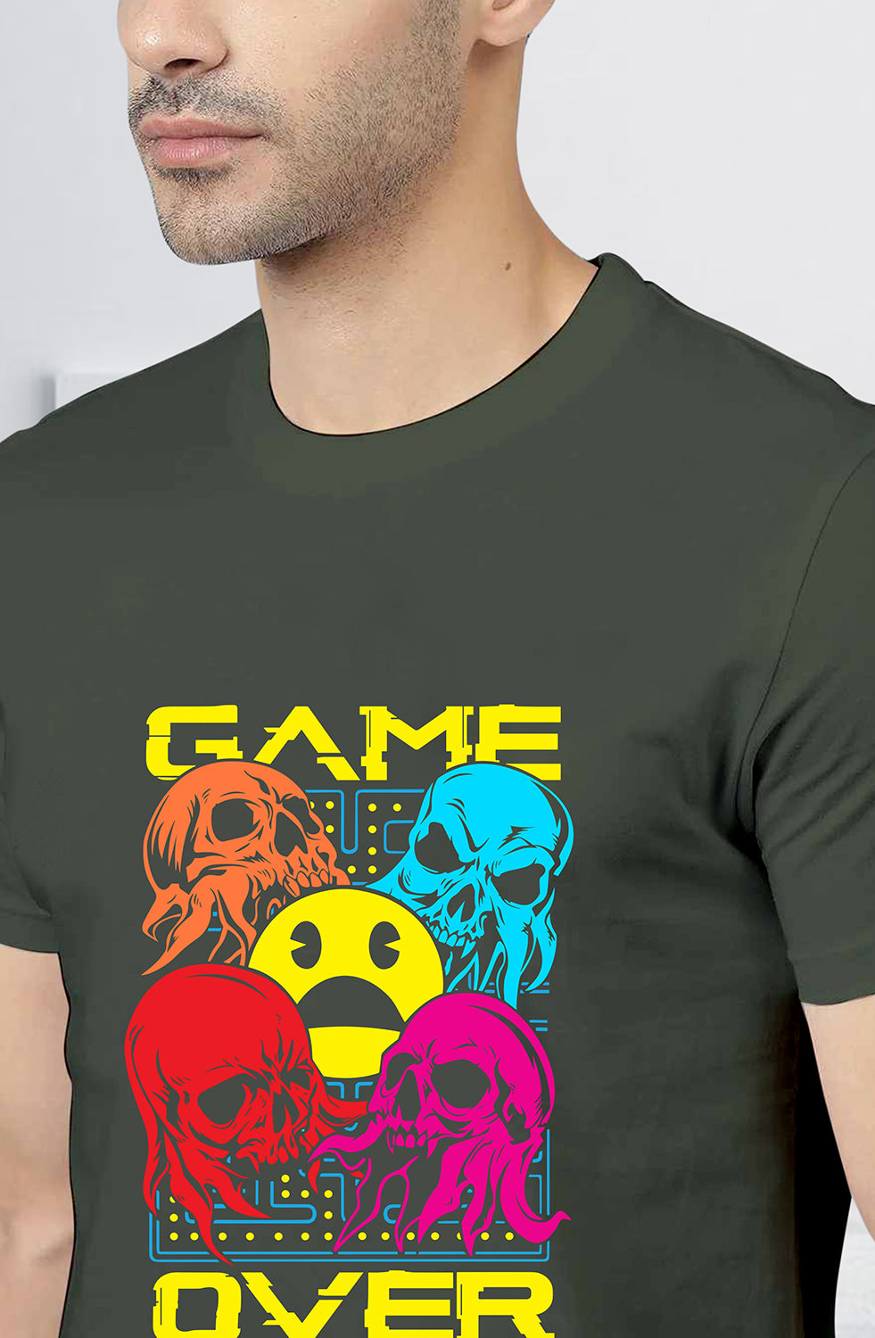 Elevate your everyday style with this Olive Green Round Neck T-Shirt featuring a striking black graphic print on the front. Made from 100% bio-washed sinker cotton with a sturdy 180 GSM fabric weight, this tee offers a perfect balance of comfort and durability.